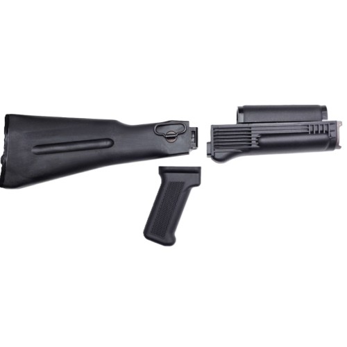 Arsenal US 4-piece Black stock set for Arsenal stamped receivers and other Mil-Spec AKs with 4.5mm side folding rear trunnions. Each set includes a left-side folding buttstock(complete with trap door), lower handguard with stainless steel heat shield, upper handguard and a pistol grip. All parts are US Made from Black Polymer, Arsenal, Inc.